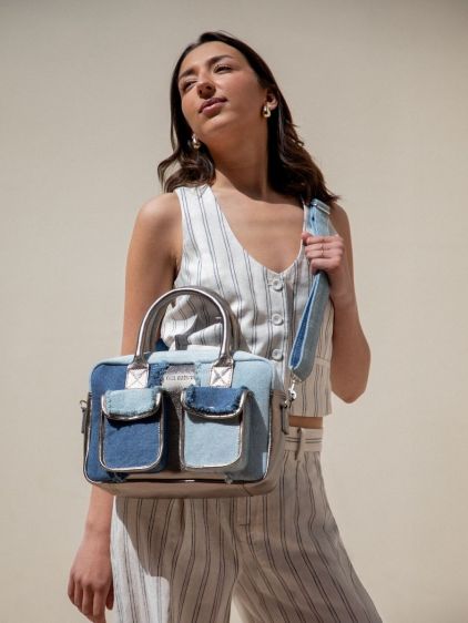 DENIM-LEDER-HANDTASCHE IN LÉOPARD UND WEISS LeDandy S Chimère – Denim/Weiß