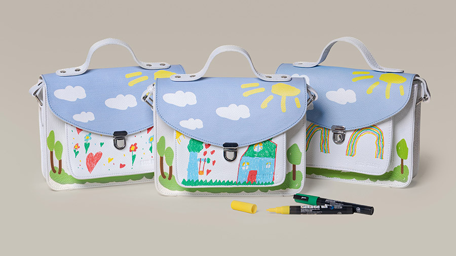 Mit Ré-Création schmückt sich Mademoiselle George mit einem Dekor, der von der Welt der Kinder inspiriert ist: blauer Himmel, gelbe Sonne, kleine Wolken und stilisierte Bäume erinnern an Schulkinderzeichnungen.Und damit die Geschichte persönlich wird, dient die große weiße Tasche auf der Vorderseite der Tasche als leere Leinwand, die Sie gemeinsam mit Ihrem Kind in einem Kreativ-Workshop in unseren Boutiquen individuell gestalten können.